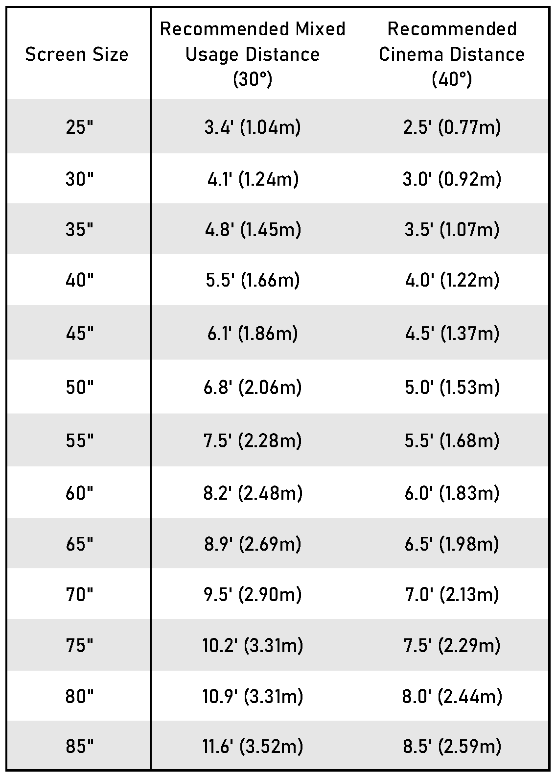 The Society of Motion Picture and Television Engineers recommends sitting at a distance where the screen fills up a minimum of 30° of your field of vision for a good experience.